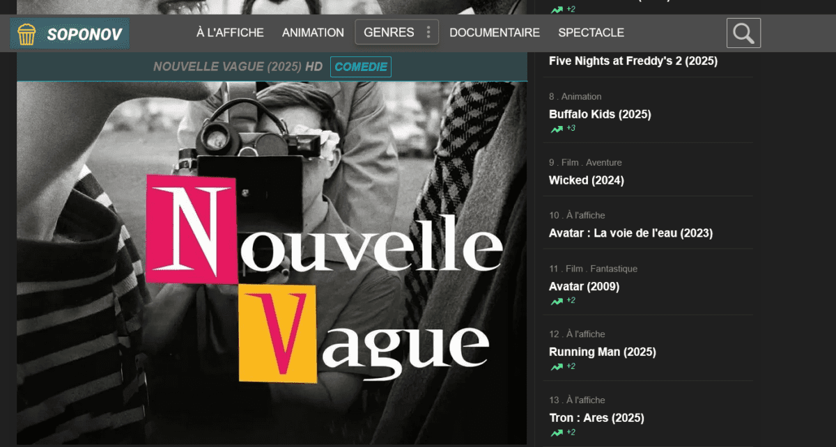 Soponov, c’est une plateforme de streaming en ligne proposant un large catalogue de films et parfois de séries, accessibles sans inscription. Elle attire principalement les utilisateurs qui souhaitent regarder des contenus récents ou populaires sans abonnement payant.
